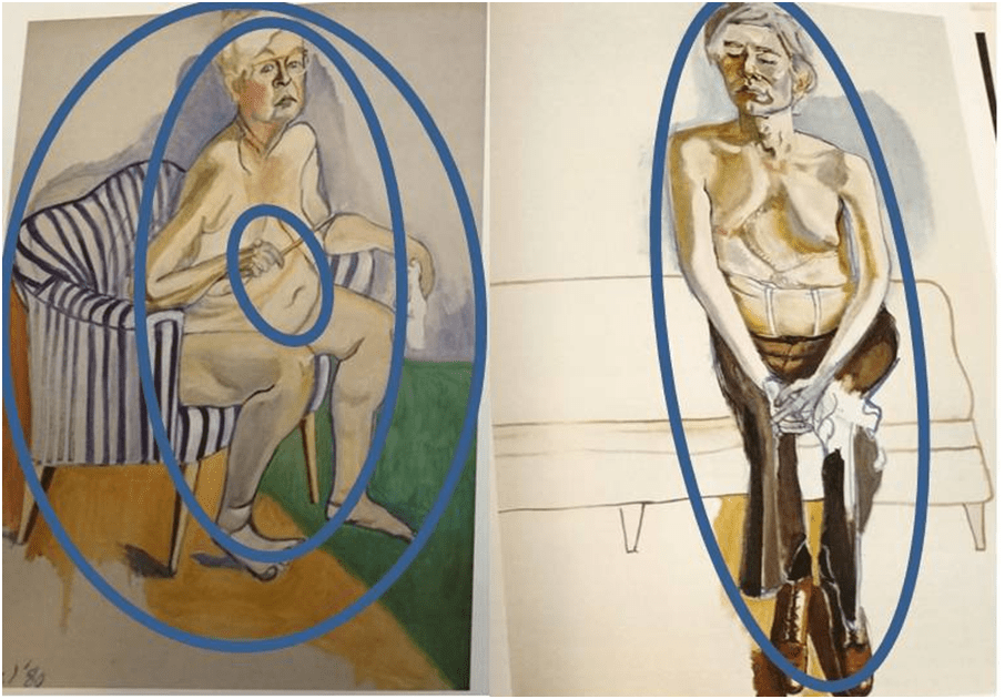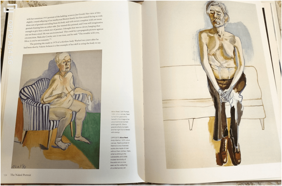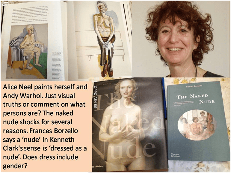Frances Borzello’s The Naked Nude (2012:124f, pictures in revised ed.2020: 134, 136)London, Thames & Hudson. Shows Self-Portrait 1980 & Andy Warhol 1970 respectively, both by Alice Neel.