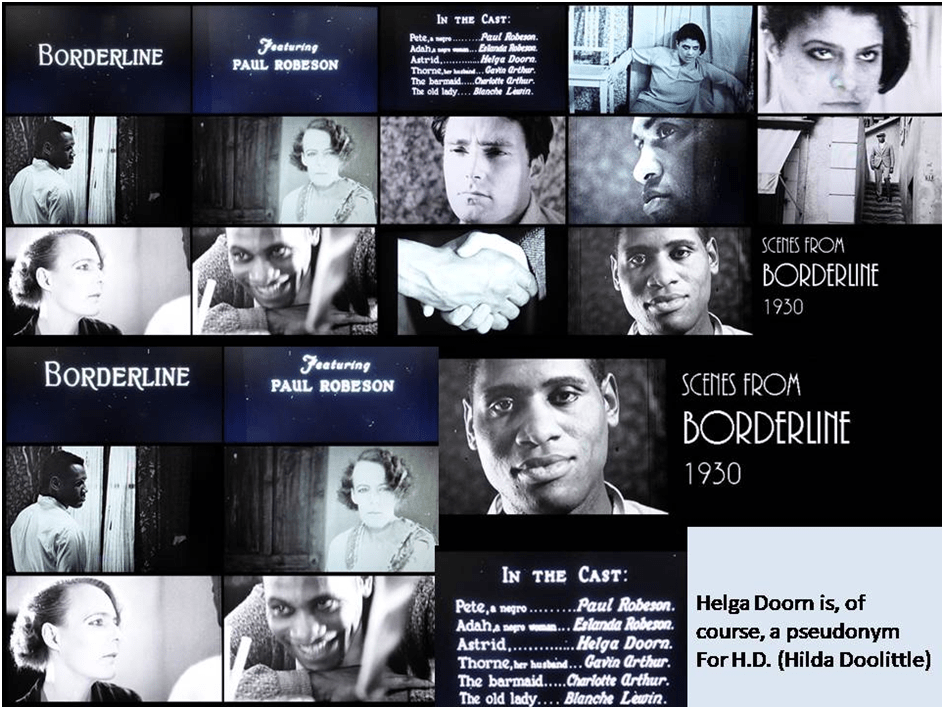 The same sentiments could be, and were, expressed about Bryher, or even her own male alter egos. Even before Susan McCabe evokes queer theory to discuss these writers, Louis L. Martz in 1983 cited the importance of the 1930 movie Borderline by the queer husband and sometime lover of H.D., Kenneth Macpherson, It was made by a production company (POOL) including (and using as actors) both H.D. and Bryher in which H.D. played Astrid, half of a couple living in a ‘borderline town’ in mid-Europe: ‘borderline social cases, not out of life, not in life’. They are matched by another couple (played by black actor, singer and activist Paul Robeson and his wife Aslanda) whom H.D. describes as dwelling ‘on the cosmic racial borderline’. Of her own part, H.D. says: ‘Astrid, the white-cerebral is and is not outcast, is and is not a social alien, is and is not a normal human being, she is borderline’. [5] There is no doubt her that the concern with transition across boundaries (the very heart of queer theory) was always central to H.D and Bryher and it is for this reason then as well I call this book a ‘bi-biography’: a book of innovative approach to not only sex/gender but to the concept of identity generally.