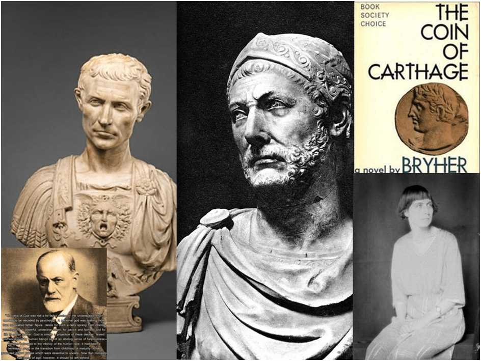 Characters from those strange, distorted histories. built sometimes of random stories collated by unreliable processes of associative memory, are very important in the connection between H.D., Bryher and Freud for both artists were friends, and sometimes consulting patients and research students, of the Professor and shared the relics of the sources of their lives including common memories and reading. I pick out one here one central to my argument – one that linked not only the fantasies but the theories of sexuality of all of them, even Freud’s now hated (but equally misunderstood) theory of ‘penis envy’ as a characteristic of female development. H.D concentrated on a favourite character of Freud’s daydreams and wishful aspirations, Hannibal of Carthage. I quote at length because this passage is as important as an index of what H.D does not say clearly about herself and Bryher, as well as about Freud and his discoveries about the similarities of his experience to a certain understanding of that of ‘mad’ persons, imagined in their ‘cells’ or ‘cages’ enacting roles in a ‘play’.
