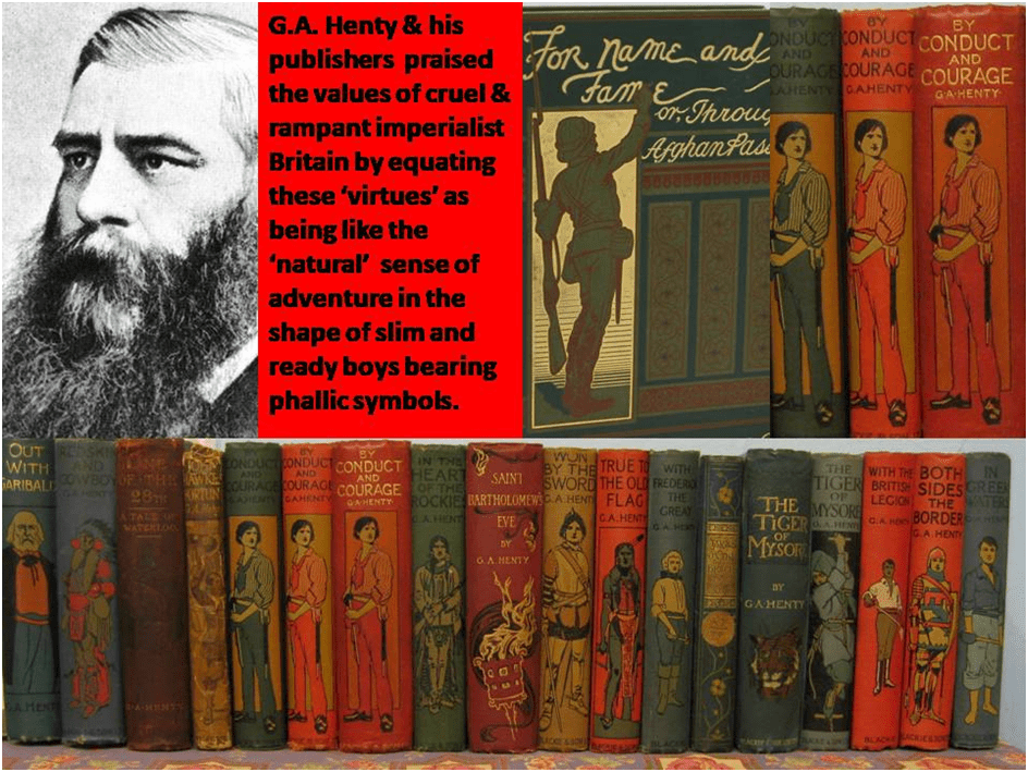 Such worthiness as shown by Cleopatra’s noble act of suicide was in Nancy’s (and, of course Bryher’s) prior imagination represented only by being a boy with ‘boyish’ yearnings for outward adventure and independence – the stuff Bryher gained, it is thought, by reading the novels of G.A. Henty. [15] The latter, and his publishers and illustrators of course, implicitly praised the values of cruel & rampant imperialist Britain by equating these ‘virtues’ as being like the ‘natural’ sense of adventure in the shape of slim and ready boys bearing phallic symbols.