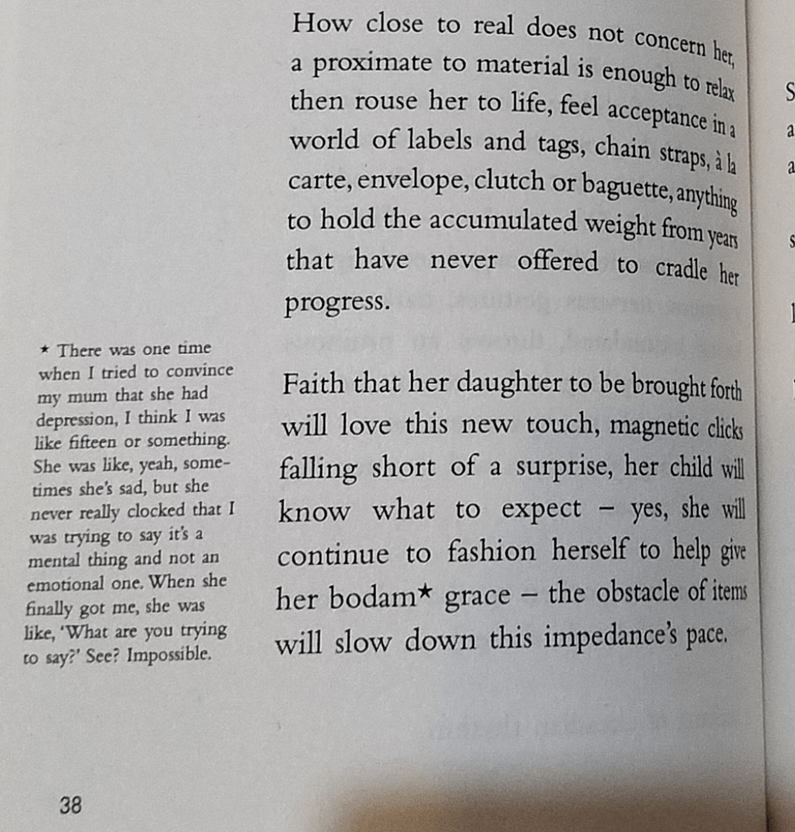 In the mean-time the content of these voices is about how we tell the story of bearing the mental drag of ‘accumulated weight from years’, and not just the story of one’s mother, though it is also that. It is the story of how historical and contemporary structural oppression is borne by the person who has, with or without knowing, introjected it. If the marginal voice is the son’s voice, it is a voice we cannot read without irony for it does not do other than translate the terms which the woman who tries to wear her internalised oppressions (her bodam) with some pride, unconscious of doing so, into the terms of Western psychiatry. Would it be better if she, as the marginal voice does, translated such bodam into the ‘fact’ that ‘she had depression’, as her adolescent son thought she should. This from a son who distinguishes mental states from each by words like depression, assuming a precision to them: ‘He is not depressed but flat, …’. He may feel blocked into a corner by her resistance to this explanation, that she is ‘depressed’, and its corollary that she accept appropriate help from modern services (and perhaps the iatrogenic consequences) but she may be simply right to ask him: “What are you trying to say?”.