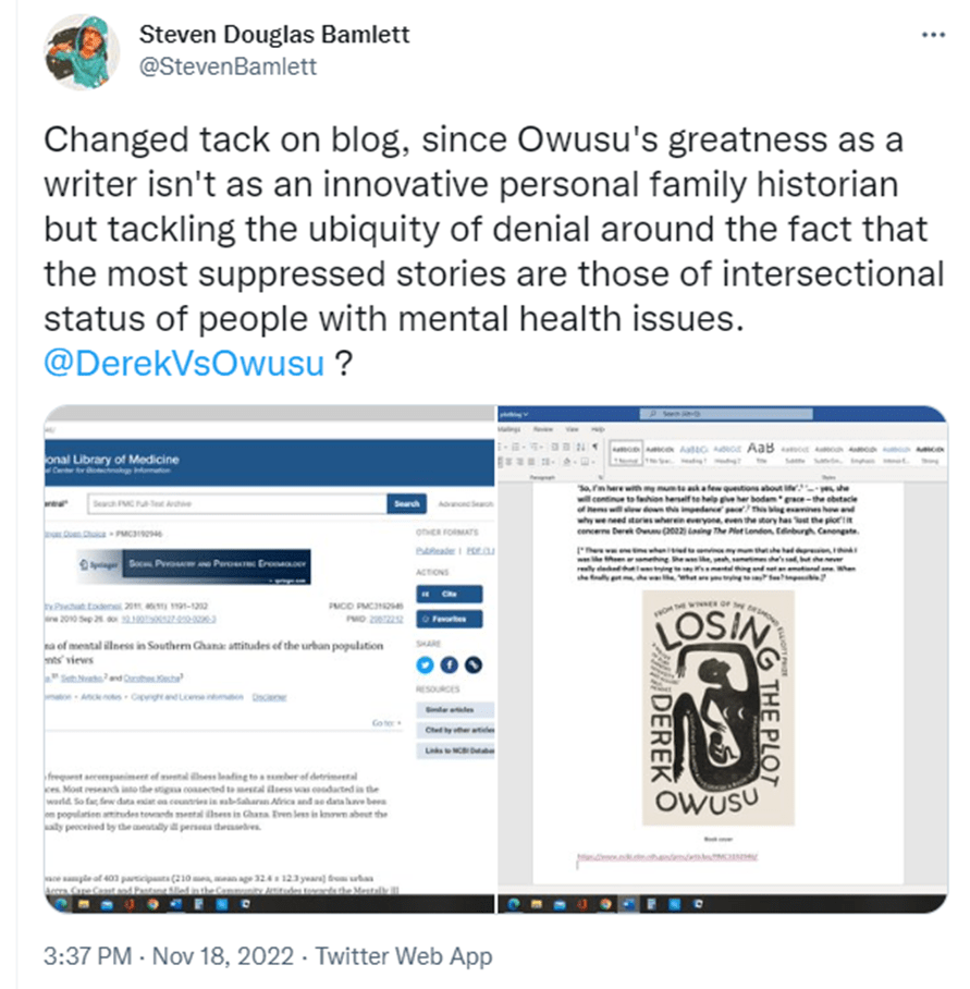 2 thoughts on “‘So, I’m here with my mum to ask a few questions about life’. ‘… – yes, she will continue to fashion herself to help give her bodam * grace – the obstacle of items will slow down this impedance’s pace’. This blog examines how and why we need stories wherein everyone, even the story has ‘lost the plot’! It concerns Derek Owusu (2022) Losing The Plot London, Edinburgh, Canongate.”