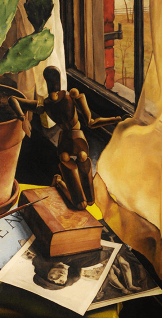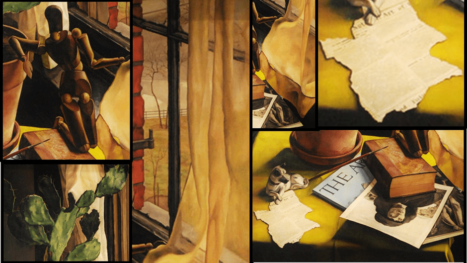 Its physical contortions are stressed ones. It’s purchase on a position in the world is literally tentative. Only one knee of the articulated figure’s left ‘leg’ assists it to hold on at its base, elevated as it is above the book on which it surely cannot securely ‘rest’, although the foot of that ‘leg’ hooks over the book edge as if attempting a locked position. The other leg hangs in air. The weight of that leg would cause it to topple were it not that the figure is meant to lean on the cactus’ plant pot with a hand hanging loose from the plant pot edge. Moreover the right hand’s is placed in such a way that it appears to be grasping the yellow gauze curtain at the window for support, although clearly such an interaction must be staged by the scene designer. The anthropomorphic feel here is, in my view of it, an indication of motion ‘stilled’, such that it avoids the precarious subjection to time and motion that might result in a fall, the consequence of imbalance.