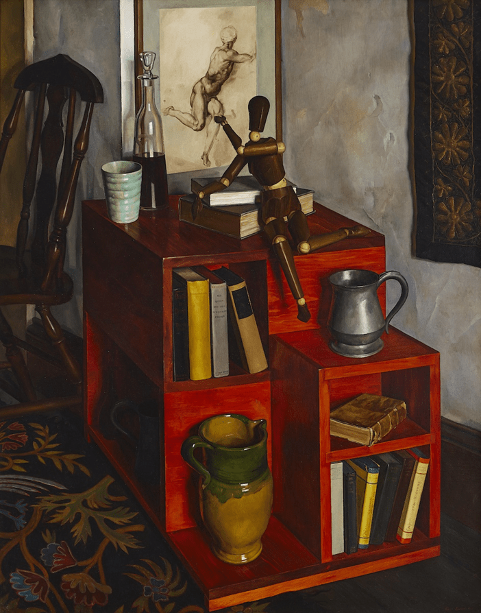 About what are these ‘contemporary conversations’ then in this painting: I would guess they are Luigi Lucioni’s attempt to bridge Lombardy and Vermont, his past and present, the art traditions of the Renaissance with their frank appreciation of male beauty clothed or unclothed and the retreat of modern art to landscape and still life, faithfulness (this the dog suggests) to one’s private and interior queer desires and emotions or looking out to a world that silences such emotions, at least to the degree that it can actively fail to recognise them if it wishes. This is why this is a painting about ‘time’ but placed in stillness by its circumstances: many of its ‘contemporary’ conversations, those at least that represent gay love and desire are silenced. By an interior that becomes increasingly to look like a closet. In my view, this is what links it to Anachronisms, where the mannikin appears again, aspiring to the beauty of a male nude in art as if he were clambering up to it against presented (and very present) difficulties, but it is a nude positioned in the past not current history of art for Luigi. Again the climber’s position is unstable unless time stands where it is, barely supported by books and artistic aspiration.