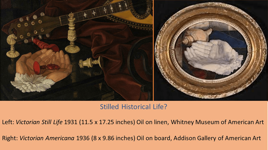 Of course, it is easier to make this case where the painting invites anachronistic narrative to some viewers such as the modern art establishment, even its radicals such as Clement Greenberg, were trying to shut down, and which again, as a consequence, would silence queerness, which depends on the instabilities of temporality and onward self and other discovery. Does it explain other still lifes where the human figure, gesture or autobiographical is less obviously pertinent, even as symbols. Given the exclusions mentioned here I exclude a still life like Heirlooms of 1933, with its obvious reference from object to stories about the familial past. Likewise we need to exclude paintings that shout out in silence like Victorian Americana (1936) and Victorian Still Life 1931 where the story from the past is about (in a very indirect way since the meaning only enters because it belongs, as it were, to the antique object contained in the still life) some gesture of giving or submission, whose narrative context has been lost. However, it is important to recognize that the transformation of items charged with family or cultural-historical meaning still have their stories fully silenced or stilled into something that seems a piece of retrieved archaism from a past that was loud with stories, of love and gestural giving between persons. It is as if the time of history as been stilled in the sense of being silenced. Whilst, I do not intend to argue this in any detail, it is worthwhile to see copies of at least the last two pieces.