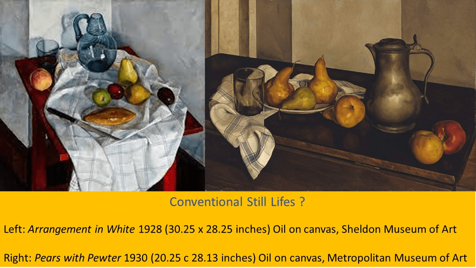 Of course there is information in excess in the above set of definitions but we will find some of it of use in looking at Lucioni’s stunning still lifes. I extend to start with a fascinating 1933 example entitled Contemporary Conversation.