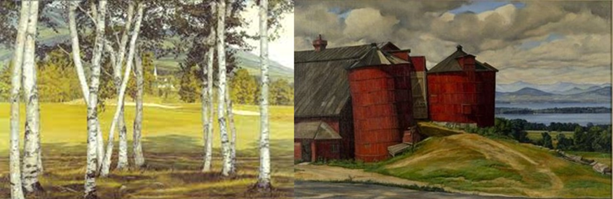 A brief look at the picture such as I have offered in small reproduction might seem to confirm what Saunders says but Alexander Nemerov sees a myth in that painting motivated by complex emotional energy and resistances that balances homesickness with the desire to overpass, the eye travelling beyond the archaic lifeless village to an unseen place equated with the rising peaks of Mount Mansfield and the clouds above. Of course I add to Nemerov’s meaning here my own queer perspective.[15] Nemerov’s beautiful reading relies on the depopulated and empty feel of a village that seems located entirely in the past, and shows that replacing a bounded homesickness might be a love of a restless landscape. He speaks of the town portrayed as denuded of a vibrant religion and showing nothing but a whited spire ‘once occupied by angels and gods’ but no longer: ‘resistant to historical change. Lucioni’s Stowe looks like a nineteenth-century village, with no automobiles, no gas stations’. Around that sterile town and beyond it, on the other hand ‘the land is restlessly on the move, as if subject to the plate tectonics underlying art itself. Landscape has moved up, taking center (sic.) stage’.[16]