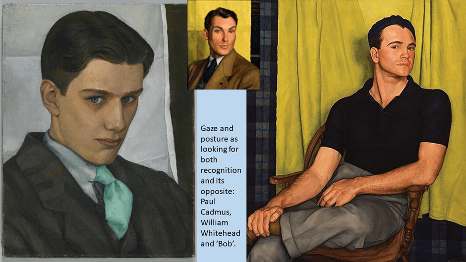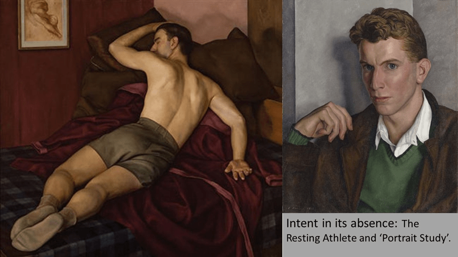Brody argues that, unlike Paul Cadmus, the closet is apparent in these portraits in their refusal of openness to allowing a viewer not already in the know to do other than ‘disavow any overt sexuality’ in them.[17] Yet this is to pretend that sexuality always takes the raucous form of Cadmus’s The Fleet’s In. Brody’s analysis of the queer circle of Lucioni as they appear in portraits is in fact an acknowledgement that sex may be more apparent in an indirection in direct gaze, which makes the process of mutual recognition itself sexual, even when not a matter of overt sexual body parts or nudity. How one holds one’s own body and the torsion and tension of body become sexual, especially the body caught in sleep and facing away from us (but not forever, as in Resting Athlete (Amateur Resting of 1938). May I just leave you with inadequately reproduced (by me not the catalogue) examples.