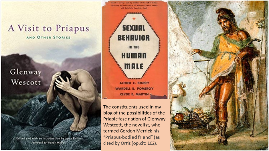 In terms of the fascination with a large phallus amongst the gay communities pictured, Merrick may indeed have been boasting in his presentation of the psychic fascination (narcissistic and from others) that Charlies ‘sex’ causes in both men and women in The Lord Won’t Mind and the other Charlie and Peter novels (it is hard not to find this somewhat laughable after many repetitions of it). We might think that because his hero as an American novelist, Glenway Wescott, made Merrick one of the many men against whom he mourned his own supposed penile deficiency (supposed because his right to call himself small was contested personally by his friend, the sex-researcher, Alfred Kinsey (see my blog on this at this link). Westcott introduced Merrick to E.M. Forster, ensuring both became early readers of Forster’s unpublished gay romance Maurice, and called Gordon (although maybe not to Forster because Ortiz is not explicit about the quotation’s source) his “Priapus-bodied friend”.[23]