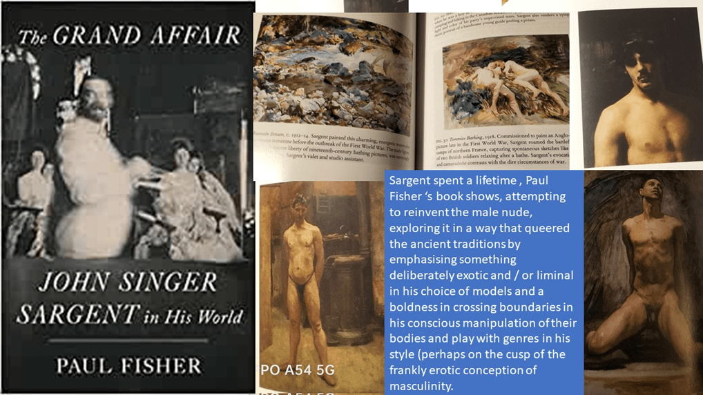 For instance, the nudes shown in the collage picture above (all from colour figures used in this book) derive from both ends of John Singer Sargent’s career as a painter. I have already blogged a response to this issue in relation to the wonderful portrait of Thomas McKeller (bottom right). The blog is on a book that is about, in the main, the story of the two men’s relationship as artist and model and called Boston’s Apollo. The blog can be read via the link here. I stand by my views there, even whilst blushing at their opinionated delivery. The relevance of Colm Tóibín’s thoughts spoken about in the blog, though is clearly complemented, and extended by Fisher’s reading of the painting in this biography.