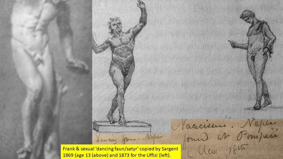 Fisher notes that from the very beginning John, even when aged 13, had what a ‘scholar’ named a “serious interest in antiquities”. However, Fisher interprets that ‘fact’, in the light of ongoing debates on the use of a fig-leaf in the USA to desexualise the fine art understanding of male beauty. That motivation ensured that his work, even in teenage, included nudes with a fig-leaf to hide the genitals of men in the Vatican collection especially (Michelangelo’s art had been restrained in this way by Popes since Paul IV in 1557) and those without a fig-leaf as in the Uffizi.[5] Moreover, one example from this early sketchbook shows that he was aware of the way Greek art portraying male nudes bifurcates around figures associated with myth that are respectively nearer to the divine form of a God (in the ‘divine human’ form of Narcissus) and those nearer to the animal kingdom such as the satyr. John’s drawings brought together the ideal human form of Narcissus with the grosser form of a satyr. [6] This bifurcation is revealed in differences of gross anatomy, even in the young John’s modest examples above, including the central visual focus upon and size of the phallus in the case of dancing satyrs without fig leaf cover. However, he also points to the fact that this interest confined itself to male figure, in large. The use of such evidence to point to a queer interest is typical of the book, though it marshals too all the arguments used to counter that the interest was sexual. In brief, these are, as recounted early in this biography:
