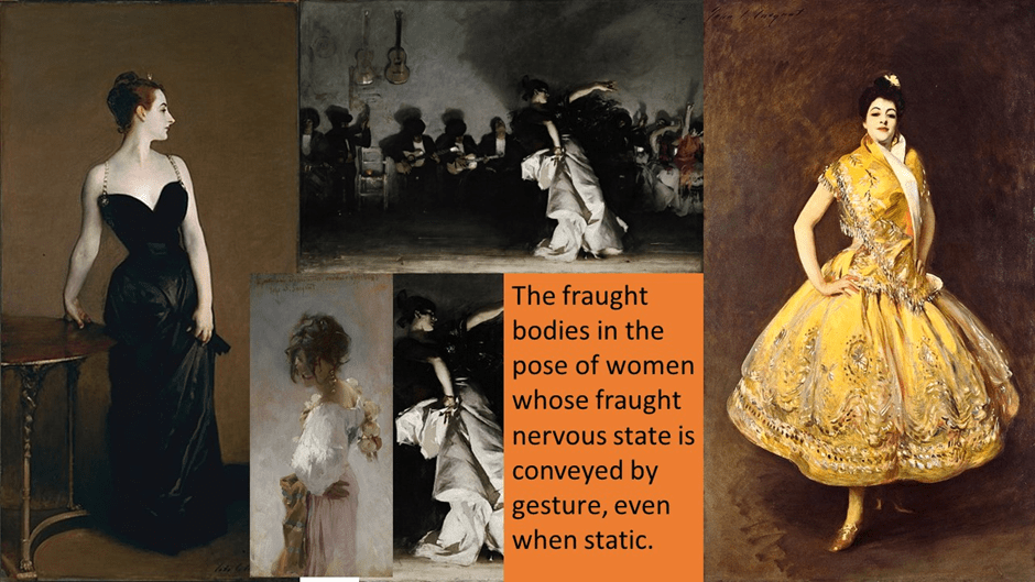 Satyrs or fauns are the precedents of liminal interest in the male sexual that is lacking in the idealised gods and heroes in Greek art. Their heirs are the marginal liminalities of groups excluded from the normative by a privileged white male-dominated society – excluded not by virtue of animal nature (though visceral animal appetite was sometimes inferred in all of the marginal groups evoked) but by class (although in pre-industrial forms like the ‘gondolier), exotic origin (in Europe and thence into the world of the Orient and the dark unknown Southern hemisphere), ‘race’ or other marginal status. Such an interest sometimes merged with an interest in the stimulated body of any sex/gender, wherein dynamic movement of limb and muscle (even past movement in a body now static and apparently at rest) was paramount. These bodies can be partially dressed or undressed, but invite a viewer to interpret a somewhat deeper interest of the model in the viewer themself. All this shows the nervous system’s role in that excitement such as Sargent would know from his knowledge of the literature of the period, particularly queer literature which could then still be masked as an aesthetic pose in front of life. This interest might explain the ambivalent respectability he imposed on female model’s such as Madam X, whom he first painted with the left dress strap fallen over her arm and who clutches a fan like a weapon. It is clearer in Flamenco dancers like that one in Le Jaleo, or the figure of Rosina or Carmencita, with whom he was somewhat scandalously connected in his later life.