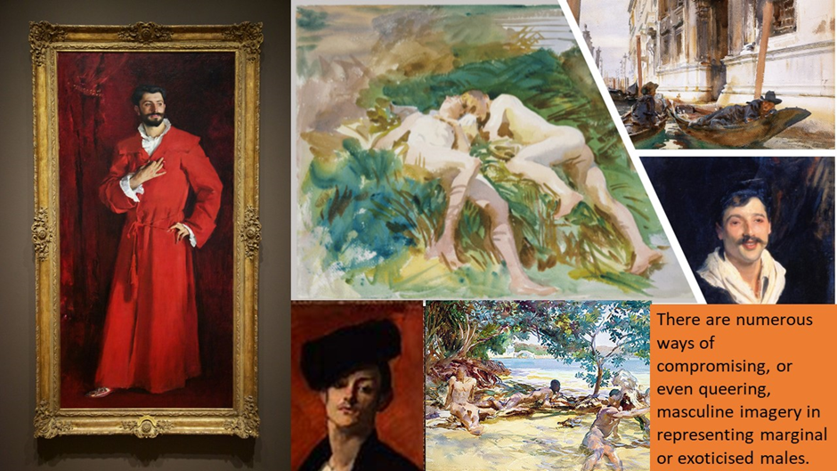 When these figures were men, their invitation is difficult in the twenty-first century not to see as sexualised and this is often an effect of borrowing gestures thought of, at the time and in some domains still, as ‘feminine’ gestures or poses such as a hand on the hip or a direct gaze upon the viewer and full features that are sexualised in paintings of women in the period, such as fulsome lips or rich red colourings of body or clothing. There are many ways of compromising, or even queering, masculine imagery when representing marginal or exoticised males and Sargent’s repertoire of these is wider than in any painter since the seventeenth-century.