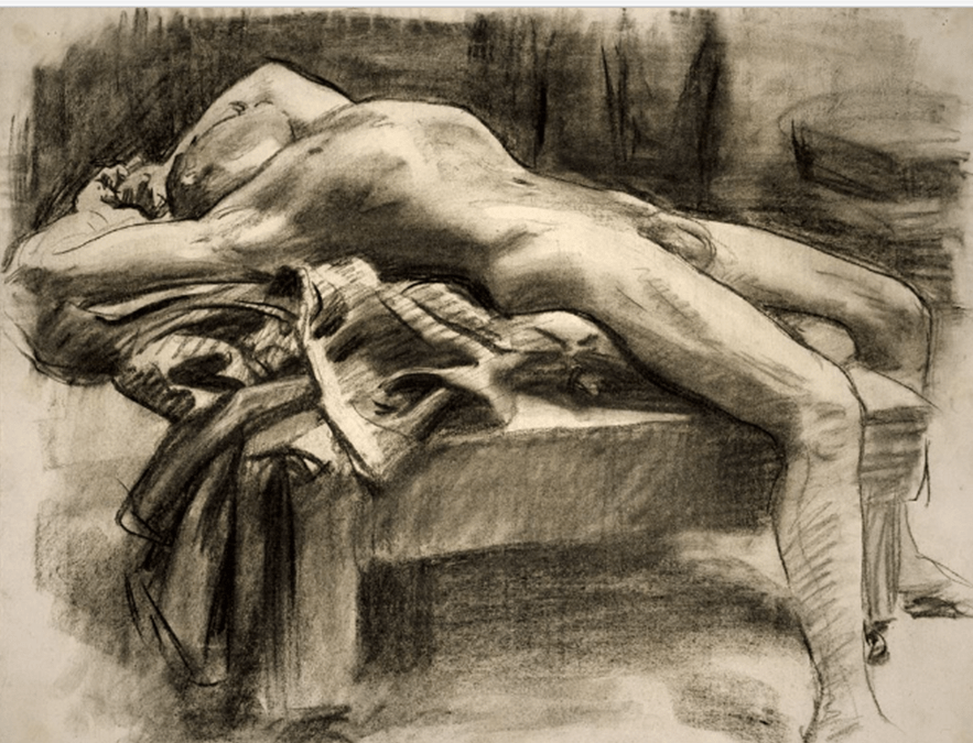 However, we need to remember that there are all kinds of dangers in the manner in which Sargent focused on the exotic and marginalised, which replicate relations of power between the privileged and less privileged, not least in projecting onto the latter the sexual fantasies of the former. It is the kind of racism investigated by Franz Fanon, or Orientalism investigated by Edward Said that we sense here. However, we also have to admit too that, as with his contested portraits of Jewish people of which elements feed racism, they may enable a kind of joy in difference that broke the norms of the privileged and their sustaining ideological conventions of what it is acceptable to represent. The same can be said of E.M. Forster’s, or more extremely Proust’s, representations of queer life or the ambivalence of Addington Symonds over the glorification of exotic European versions of the non-industrial service-working working-class, such as what Fisher calls the ‘accommodating gondoliers’ of Venice, whose availability to rich queer or ‘questioning’ patrons was legendary in refined male society. These ‘accommodating’ men were often also accommodating because of poverty and may be more closely associated to the male brothels that also adorned ‘Belle Époque Venice’. [10] Likewise, Fisher shows the relevance of complex power relations in Sargent’s relationship to male models throughout his career, in which the sexualisation of the model also indicates the power of the manipulating artist. We can use the word ‘manipulating’ richly since Sargent was known to favour the manual handling of his nudes to achieve and freeze the desired pose in them. This is apparent in the 1870s, in Sargent’s late teens and early twenties, in the ‘spread legs and outthrust belly’ of A Male Model Standing Before A Stove, which Sargent further emphasised in his painterly choices of colouring and impasto.[11] It is glaring in the ambivalent treatment of the endlessly accommodating Nicola d’Inverno, one of many Italian candidates and made to play a ‘gondolier’ as well as become Sargent’s willing servant and tent-sharer in his camping holidays. Another model though may have been manipulated into the pose of the Reclining Male Nude drawing (1890- 1915).[12]