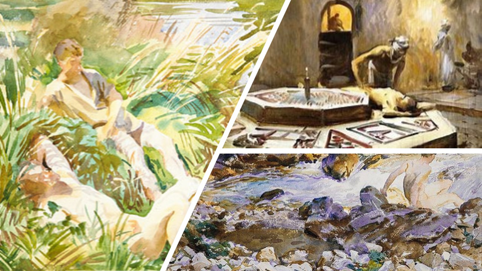 The most interesting examples from the end of his career show Sargent’s interest in marginalised black American men, but notably his now most famous model, Thomas McKeller.[13] Even in his natural landscape and war paintings (genres not accustomed to the display of male nudity) Sargent picked out male working-class nudes, found in situ it is suggested, of exceeding whiteness to blend the ‘innocent liberty of nineteenth-century bathing pictures’, such as The Mountain Stream and Tommies Bathing respectively, with something more tantalisingly exotic. For surely here innocence and experience binaries are questioned like other binaries elsewhere and all in the name of a kind of superficially natural class of man untainted by bourgeois morality. Otherwise Sargent embraced bourgeois morality as his favoured persona, much as did his friend Henry James, who was even more cagy.[14] To modern tastes Sargent may even be seen to parody his interest in artists manipulating models in his truly Orientalist painting of Massage in a Turkish Bath House.