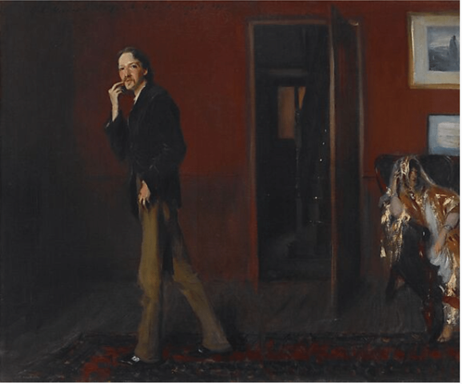 That this painting is called Robert Louis Stevenson and his Wife tells us a lot about the painting of nervous se/gender interactions. The ‘wife’ is reduced to the shimmer of rich clothing. See https://www.metmuseum.org/art/collection/search/21403