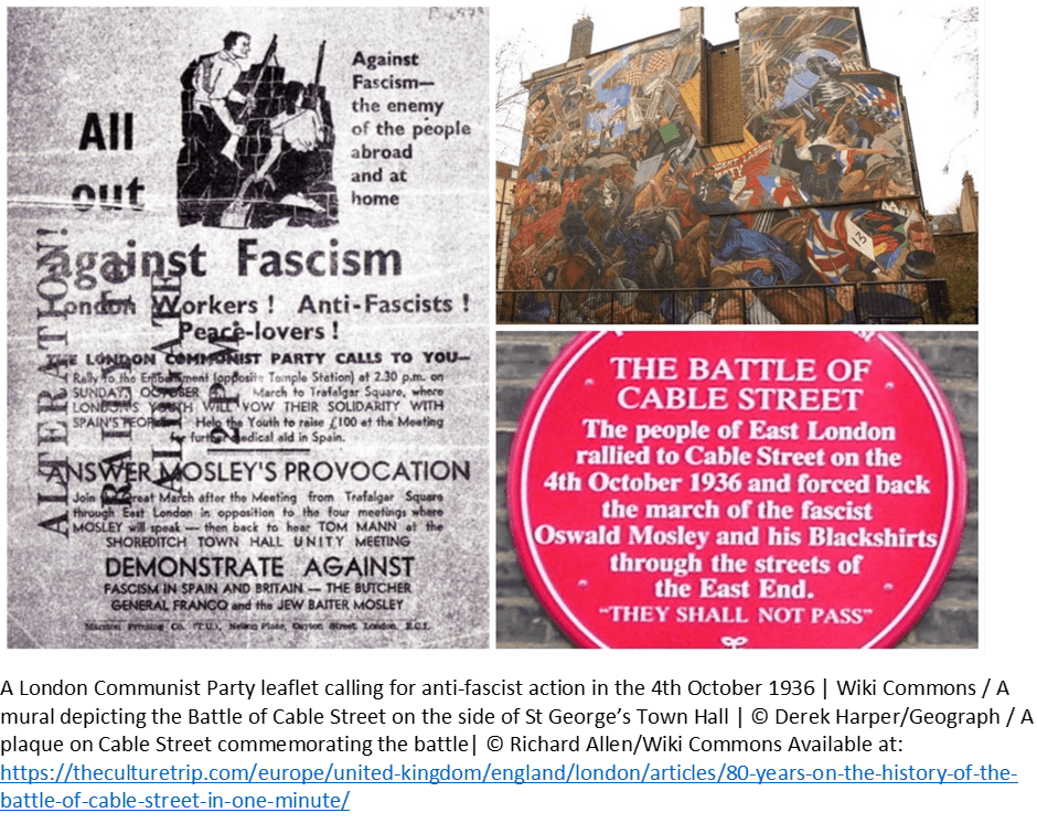 A review in Theatre Weekly does at least show us that Tracy-Ann Oberman, who plays Shylock in this production, has used her own family’s history to emphasise the more the fact of antisemitic racism (in Russia and the East End of London) and resistance to it. This The Merchant of Venice 1936 is set in Cable Street and uses the Cable Street rising against the permission given by British Government to Oswald Mosley to parade his Fascist blackshirts, with Union flags aflutter, through the East End home streets of Jewish people on the 4th October 1936. In this re-telling Shylock is an East End matriarch based on Tracy-Ann Oberman’s grandmother, who escaped Russian pogroms. Portia and her circle are aristocratic members of the British Union of Fascists under Mosley and the locked ghetto in Venice in the text is replaced by ‘East End Cable Street, with pawn shops and money- lending under the counter of shmatter stalls, and seamstress jobs’.[17]