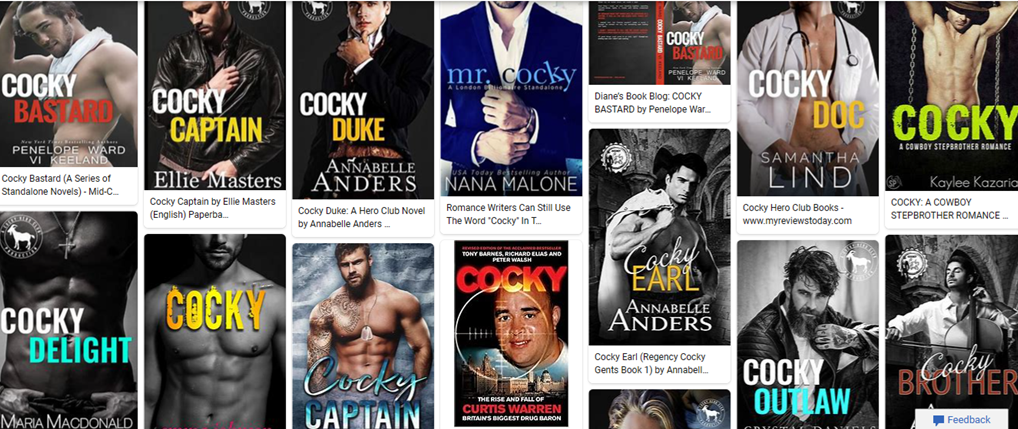 McGurl discusses the Cocky novels (an apparent series but in fact based on the endless repetition by different authors of the same formula) as published by KDP from the point of view of a consumer scanning Amazon Books. The view may not be the same, of course, in the eyes of competing authors presented in the list or not of their own version of Cocky. Faleena Hopkins was so sure that copyists had used her formula for Cocky novels in her successful novel Cocky Roomie: A Bad Boy Romance Novel (2016) that she sued Tara Crescent on the basis of the latter’s Her Cocky Doctors: A MFM Marriage Romance (2017)> In fact the trend in Kindle publishing was probably set by Penelope Ward and Vi Keeland by their Cocky Bastard (2015), which Hopkins sort of admitted, once she had dropped her hopeless legal case based on one word in a book’s title ostensibly by copying the formula of Cocky Bastard as Jake Cocker and spawning a new ‘series’ of Cocker brother novels.[9]