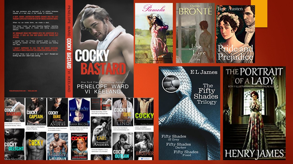 McGurl’s story is a delightful story to retell (so I did above) of the vanity of human beings but is less important than the central point of McGurl’s chapter on what the Age of Amazon had done with a genre we can call “Erotic Romance” fiction, which he describes in terms of ‘the conventionality of its kink’. He makes the point that all of the Cocky novels replicate the genre of novel made first significantly popular by the boom novel Fifty Shades of Grey by E.L. James, published digitally in 2012, that uses the scenario of a woman being bound (literally) to a powerful man (in body and financial and social status) but taming him in marriage, which he beautifully summarises thus: ‘What are a few whips and chains and cable ties against the formation of a couple of such blinding whiteness and rigorous heterosexuality?’[10]