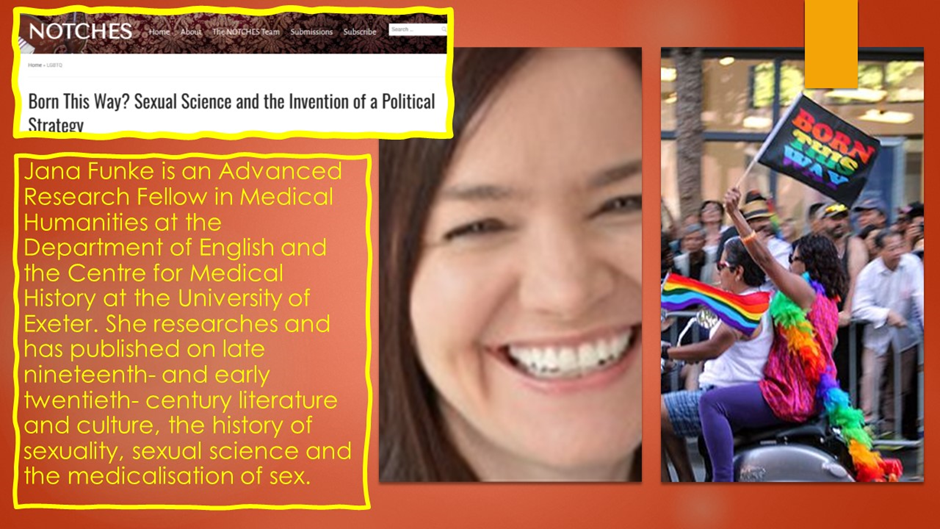 unintentionally perpetuate the notion that homosexuality is somehow less desirable if we argue for social acceptance and equal rights on the grounds that we simply cannot help the way we feel, … / … Ellis and Symonds’ correspondence suggests that they also struggled considerably to make this argument work and that they were all too aware of its flaws. …/ Although Sexual Inversion does anticipate today’s ‘born this way’ argument in interesting ways, …. While the idea that homosexuality was necessarily inborn or congenital was a useful strategy to work towards political goals, it also had considerable limitations and certainly did not capture all individual experiences never mind different cultural and historical understandings of sexuality.[34]