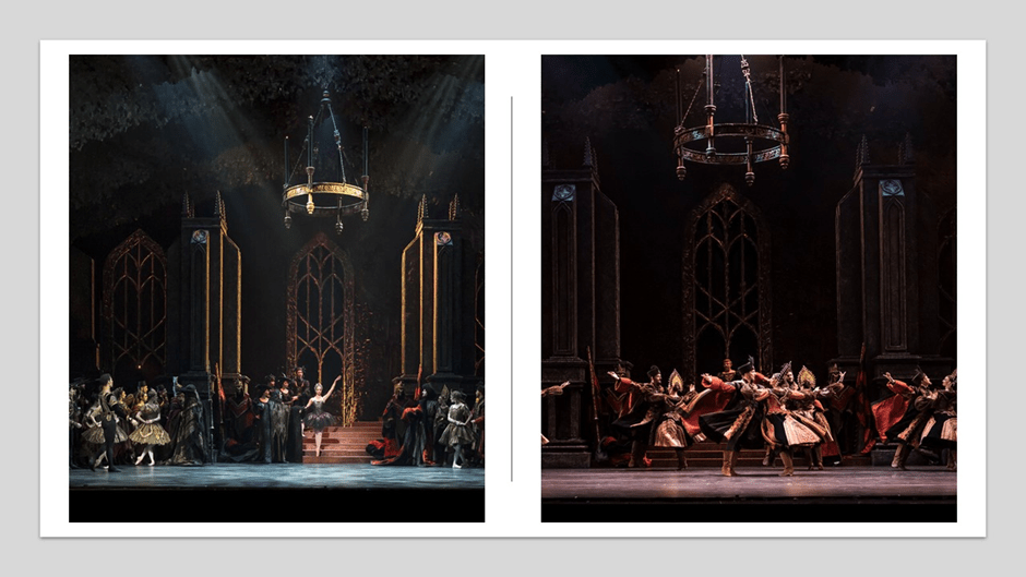 In Act II and IV the ballet body’s soloists, as we see above, individually, or in synchrony when two or more dancers, make fabulous shapes even out of three dimensional, and apparent empty, air-space. Space itself, in all its dimensions, seems to co-operates in the shaping of patterns. Meanwhile, the larger social body takes sometimes static identical form, using a stance of apparently unnatural ungainliness (as seen above) –  but yet truly beautiful in its spatial rhythm in the whole social body. The whole shaped line of this corps de ballet forms a background for the space they define. In this space principals, soloists or a smaller distinct group perform their exquisite, differentiated dances. The whole of each body is mirrored in the body of others that make vertical and lateral shapes using the depth, height, and width of the stage. Sometimes the corps dividing itself to form ever more exquisite coming togethers or even graceful exeunts (stage left or right). Avian form is suggestive in this ballet of ways of handling these moments proper to the art form hence the wonder of Acts II and IV. However, the courtly settings of Acts I and III also provide analogous uses of individual and social bodies in three-dimensional space.