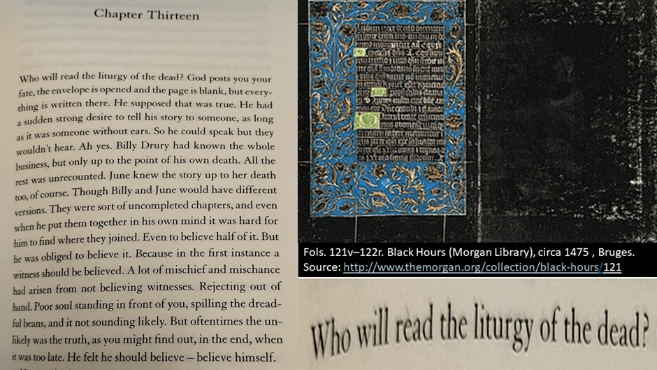 Who will read the liturgy of the dead? God posts you your fate, the envelopes is opened and the page is blank, but everything is written there. He supposed that was true. He had a sudden strong desire to tell his story to someone, as long as it was to someone without ears. … Billy Drury would have known the whole business, but only up to the point of his own death. All the rest was unrecounted. June knew the story up to her death too, of course. Though Billy and June would have different versions. They were sort of uncompleted chapters, and even when he put them together in his own mind it was hard to find where they joined. Even to believe half of it. But he was obliged to believe it. Because in the first instance a witness should be believed. … He felt he should believe – believe himself’.[38]