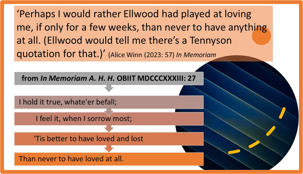 This is even so, when as a young man Gaunt writes from the trenches to Sandys, soon to be killed in action, in a way that not only references Tennyson but shows he knows the poem better than his pretender to (and ‘player’ of) love of the poetic in Ellwood. He writes: ‘Perhaps I would rather Ellwood had played at loving me, if only for a few weeks, than never to have anything at all. (Ellwood would tell me there’s a Tennyson quotation for that.)’[15] And so there is, from the final stanza of Lyric XXVII, perhaps the most well-known and carelessly repeated quotations ever. That Gaunt pretends not to know (for that is how I read it) the quotation is significant. That Henry conceals his own love and knowledge of Tennyson from Ellwood is even made clear in the novel when Maud corrects Ellwood’s beliefs about that issue, after Henry has gone missing presumed dead. He says to her:
