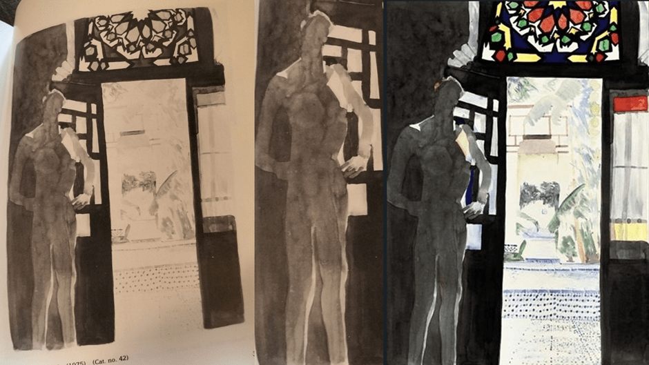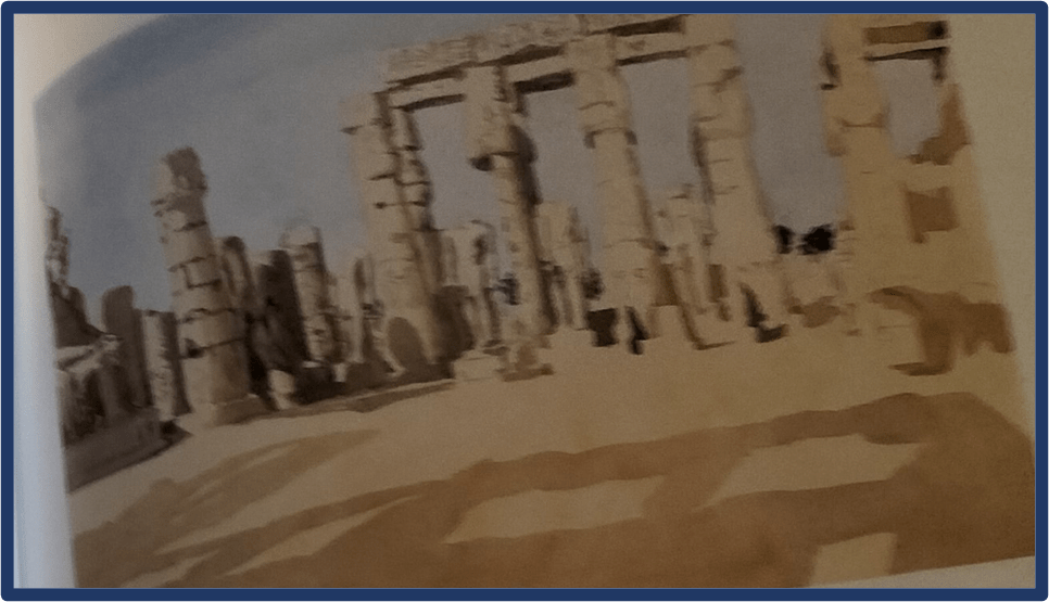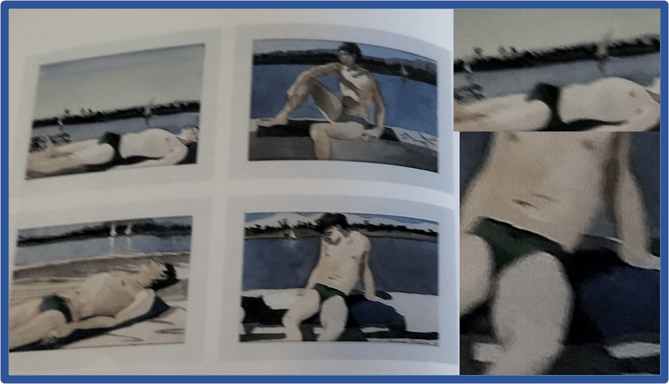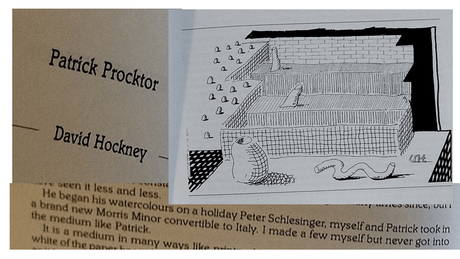 Hockney’s reference to his holiday with Procktor and his own lover (unacknowledged as such in this writing), Peter Schlesinger appears in this book as a set of watercolours of the shadowy phallic columns of an Egyptian temple placed alongside delicate watercolours with their own phallic appearances of the extremely good looking Peter in his swimming trunks in Luxor. These are near to each other in the catalogue and attest to a new use of light and shade in both figure painting and architectural landscape. They are a joy.