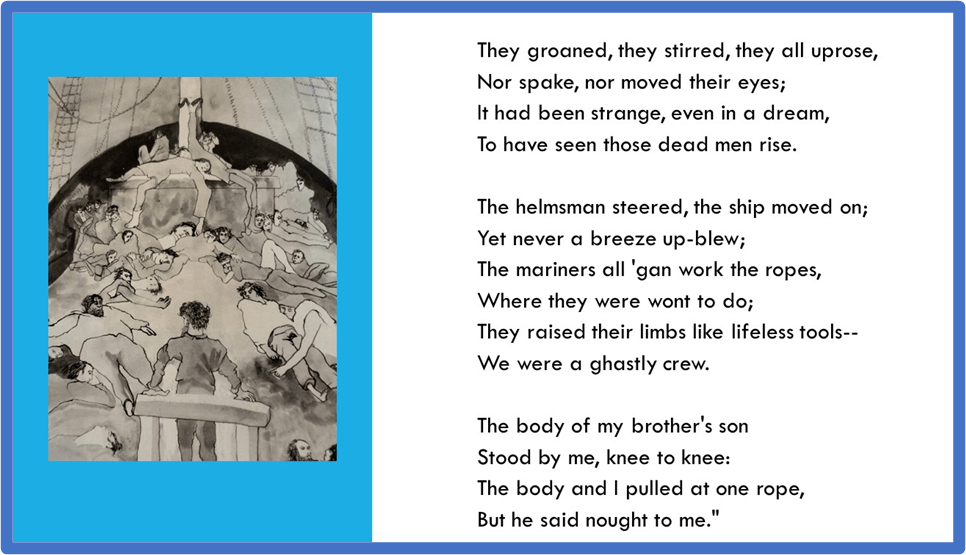 And other painting and illustrations struck me. Massey has explained beautifully and simply the motivation of Procktor(and his collaborator in this form Charles Newington) in attempting to rival as well as honour Gustave Doré’s illustrations to Coleridge’s The Rime of the Ancient Mariner. Together they produced a series of 1976 etchings, with the two beautiful two-colour aquatint ones illustrated in the Massey book, which also describes the others as 8 ‘direct extemporisations’.[3] But what are direct extemporisations? In music, they involve playing a known piece without time for preparation (ex tempore) whilst in visual art they seem to involve some kind of metamorphosis of a known image where temporality seems less involved and may be misleading. They are a kind of ‘improvisation’ but even as such they are not as spontaneous as this makes them sound. My new little catalogue provides an example from the 8 and which I believe illustrates the waking of the dead bodies of the crew to ‘man’ the ship that will return the old mariner narrating it to continuing life. The image is a strange mix of direct copy of Doré and queer differences hard to pin down.