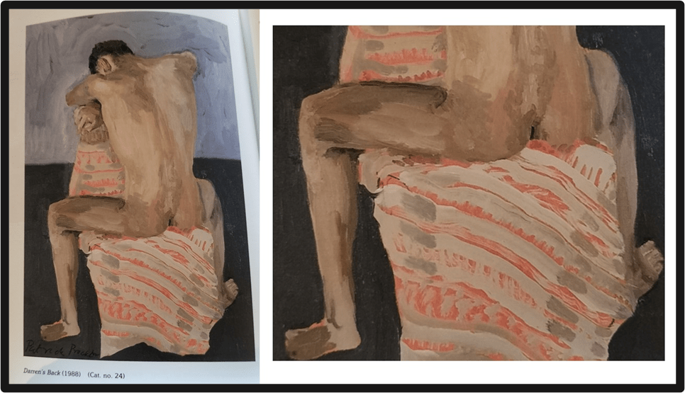 This painting is queer as a portrait of Darren Etienne, ‘a friend of’ [the queer photographic artist] ‘David Gwinutt’, and as an erotic image. It uses the rucked red line images of the cloth on which Darren sits, which is a dark vermilion at this point to emphasise the line of his anus as a point of access and egress and even, given associations of the colouring here with blood, of physical skin rupture. The aim of these paintings, according to Massey’s scholarly interpretation, can be aligned with the paintings of young queer Black men in the 1930s painted by Glyn Philpot (see the link in these parentheses for my blog). As a painting the one exhibited in this catalogue surpasses the 1988 side view of Darren reproduced by Massey, although yet again both appear to show how a portrait painter of the Black nude body needs to challenge the colour palette and treatment of the male nude as a form in terms of background as well as figurative foreground aesthetic choices. Such choices are not a matter of exoticisation of the Black nude body but an evasion of such unfortunate associations under the ‘white gaze’. [4]