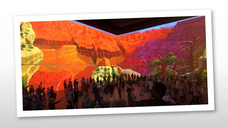 The challenge here feels too gnomic and suggestive here to be other than insulting to Hockney, and, in my view, queer pioneers of his age. And Hockney’s requirement that people see how light relate to the surfaces and relative depths of our vision in any medium – whether circumambient air or water and by showing how time varies perspective so much that nothing can be seen as entirely still and flat if seen at all is not really that dry. I did not sense that viewers found it so whose commentary we overheard. The script of Hockney’s voice-over – a collage of his voice over a number of moments in the long duration of his working life – is in the brief catalogue and is hardly characterizable as a ‘lecture’ (where did Jones go to university if his lecturers showed such intent to be understood) and never, in my view, or those I overheard, ‘dry, even ‘a bit’. After all Hockney is being purely descriptive of his artistic preparation in detailing what he learned about perspective in space and time in viewing the Grand Canyon over ‘quite a long time’ and having to ‘piece it together’. Transformed into a conventional picture based on only ONE of those photographs he said it ‘was flat like wallpaper’ and that you did not ‘see the space in it’. For if the Grand Canyon is the world’s ‘biggest hole’ and it is irregular. it’s important to realise that to look ‘into it’, you discover no ‘centre of focus’, that ‘you’re constantly looking around’, that ‘all landscape experience is ‘s spatial experience’ having time as well as physical space dimensions. Looking around in The Lightroom is not to look just at ‘gigantic projections’ as Jones thinks but to experience the time and space in the lightroom as interactive with the time of the space of the dynamic objects (even the still life and landscape ones for our eyes still saccade across and into its volumes.
