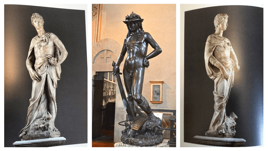 The late David in the Museo Nazionale del Bargello, Florence (centre) and 2 aspects of the early David (c. 1408-9) from Donatello: Sculpting the Renaissance London, V & A Publishing. From pages 107 & 106, respectively.