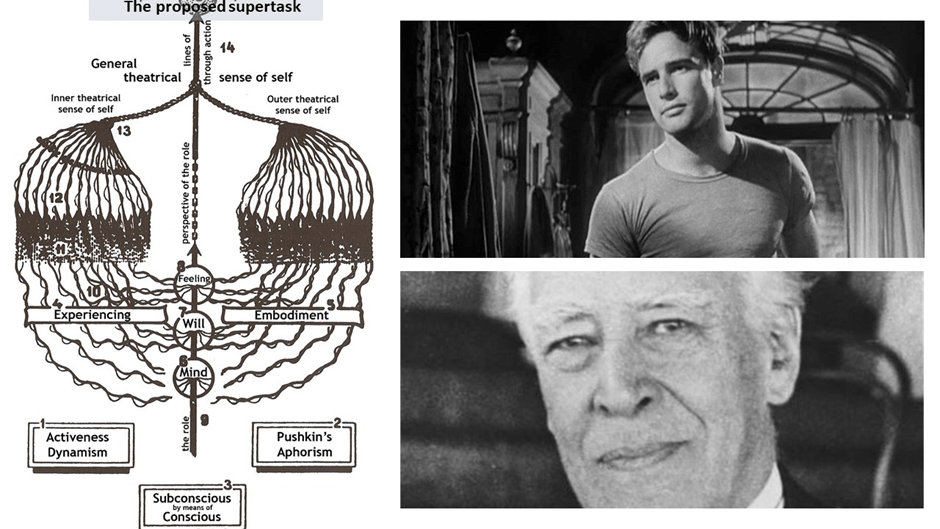 To illustrate Method Acting: Collage of cropped items: Left: A diagram of Stanislavski’s “system”, based on his “Plan of Experiencing” (1935) by DionysosProteus – Own work, Public Domain, https://commons.wikimedia.org/w/index.php?curid=10112359; Right Top: Marlon Brando‘s performance in Elia Kazan‘s film of A Streetcar Named Desire exemplifies the power of Stanislavski-based acting in cinema (Cropped screenshot of Marlon Brando from the trailer for the film A Streetcar Named Desire (1951)) & Right Bottom: Portrait of Stanislavski (Available at: https://commons.wikimedia.org/wiki/File:Bundesarchiv_Bild_183-18073-0003,_Konstantin_Sergejewitsch_Stanislawski.jpg)