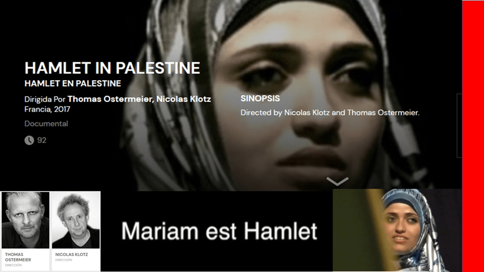 Hammad’s essay does not tie up the associations, that she surely knew, between the Freedom Theatre members, whom she interviewed and a specific production of Hamlet that involved them and about which an award-winning European documentary was made in 2017 (for the French version at least), Hamlet in Palestine. The film dealt with a collaboration between the Freedom Theatre and a German theatre Director. The former (as using the link will have shown) is a Palestinian education in theatre project situated in the West Bank refugee camp of Jenin. So much in the websites dedicated to this film even the title (in my collage above) ‘Mariam est Hamlet’, for this names an actress whose name is taken by theatre-director and actor of the Hamlet role herself in the novel, although no identity between these people is claimed by me (for I simply do not know, having never seen the film).