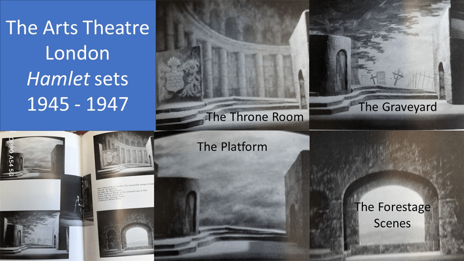 Hamlet is by necessity a play that evokes politics however persistently some directors of it in the twentieth-century have emphasised a depoliticised sexual family romance (a concept which in its origin in Freud is already political, about the very original of defensive psycho-social external authority and its representatives in social institutions and constructed psyche) or existential psychology devoid of social reference. Even before this novel it shows in the sets chosen for it. Look, for example, at the Arts Theatre production sets for the largely conventional (as I understand from descriptions of it which emphasise its ‘extraordinarily human quality’) Michael Warre version played immediately after the Second World War in London in 1945 before touring war-devastated Europe between then and 1947.[9] The sets alone however ensure that the context of any ‘extraordinarily human quality’, whatever the twentieth-century thought that meant, must be and focus political power and defensive oppression. The Graveyard setting seems to show how oppressive political war bred death. Forestalling medieval castle wall exteriors, limited the human to the few who ruled the many and the interiors (such as The Throne Room exhibited the symbolic grandiosity of an egotistic self-elevated to power, recalling even Leni Riefenstahl’s 1938 film of her 1936 Olympics coverage in service to Hitler.