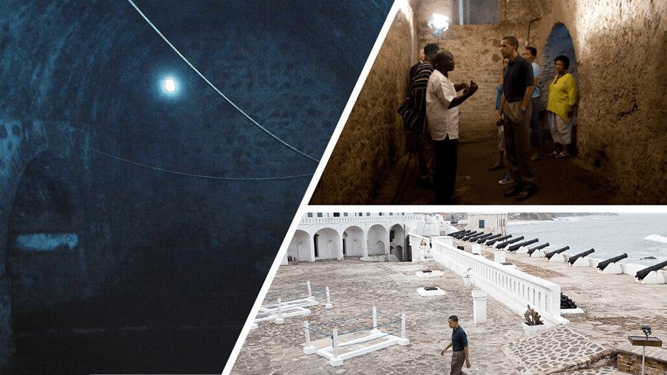 Obama outside the Castle and with family in a well-lit slave dungeon at Cape Coast Castle (1 July 2009) The White House Photostream by White House (Pete Souza) By US Government (Official White House photo by Pete Souza) Available at: https://commons.wikimedia.org/wiki/File:Barack_Obama_in_Cape_Coast_Castle.jpg & https://en.wikipedia.org/wiki/Cape_Coast_Castle#/media/File:Obama_and_family_in_Cape_Coast_Castle.jpg Another view of the Dungeon from: https://www.flickr.com/photos/usarmyafrica/3773130720/in/album-72157621894565746/, CC BY 2.0, https://commons.wikimedia.org/w/index.php?curid=98729439