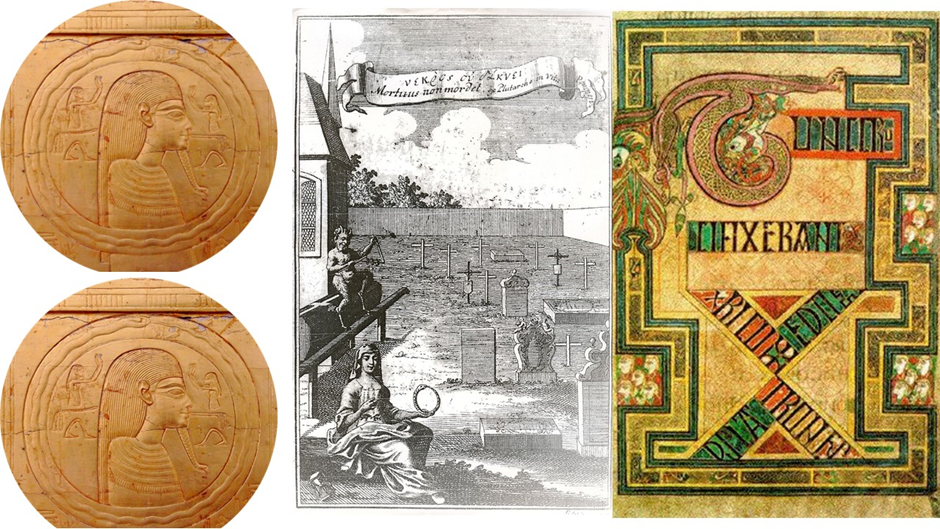 First known representation of the ouroboros, on one of the shrines enclosing the sarcophagus of Tutankhamun. Photograph from By Djehouty – Own work, CC BY-SA 4.0, https://commons.wikimedia.org/w/index.php?curid=57397072 & A highly stylised ouroboros from The Book of Kells, an illuminated Gospel Book (c. 800 CE) Public Domain, https://commons.wikimedia.org/w/index.php?curid=44586 & An engraving of a woman holding an ouroboros in Michael Ranft‘s 1734 treatise on vampires By Michael Ranft (1700–1774) – scan from original book, Public Domain, https://commons.wikimedia.org/w/index.php?curid=3086824