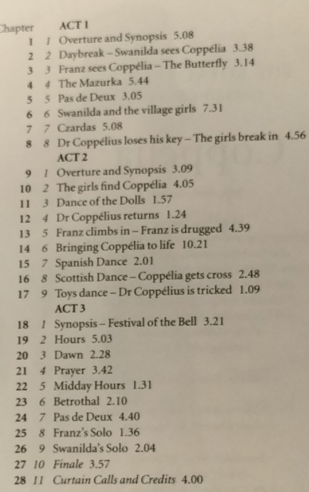 There is no doubt that such histories would have lain behind the production history of Coppélia too, for this is a ballet marked by star performance after star performance. Take this schedule of the libretto chapters of the performance I am using to preview the ballet here in which so often in the action in Act 1 or 2, where there is more story to actually tell than in Act 3, falls into excerpts entirely made up for the Principal Dancers to show their wares in solo or in a pas de deux. There are scenes for the corps de ballet certainly that are quite magnificent, if not of the dynamism of the Swans in Swan Lake, for instance the Czardas that end Act 1, but for one important piece of action linking Act 1 to 2. Set piece dances are known for the corps which most often set the theme, rather than the scene, like the ones relating to the passage of time (Hours, Dawn, Prayer, Midday Hours) in Act 3, with solo, pas de deux or national dance type raising exception of exceptional individual skill in a received dance form.