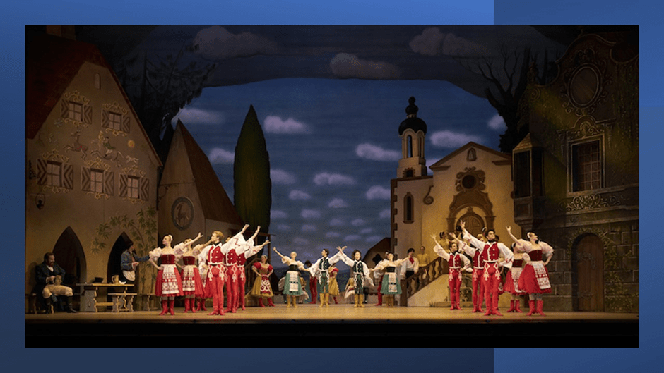 We cannot know if the partnership of Saint-Léon, Delibes and Nuitter read Hoffman in this way, but it is likely. However, we cannot either treat any production as focused on any intention of any of those originating sources. Moreover it is common to hear this ballet spoken of as, using the example of Deborah Bull introducing the BBC 2000 video, a ‘whimsical tale’, at once ‘light-hearted’ and based in a fantasy setting – a ‘non-specific mid-European state’, associated with ‘ballet land’ in the mind of ballet-goers. This is emphasised even more by Osbert Lancaster’s fairy-tale village sets, which are described as ‘right for the story’ as if it should not be taken any more seriously than a domestic folk-tale. The point that ballet has its own constraining conventions is brilliantly made By Sarah Crompton, speaking of the production on which the DVD version I watched was based but, being a year earlier, with different performers: