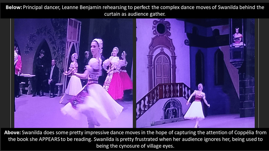 But even without this filmic perspective, the staging emphasises the self-conscious elicitation of someone to watching one’s virtuosity in performance and using it to evaluate oneself as the person watched, as both Franz and Swanilda do to the unliving doll in the window above them. Meanwhile, of the course, the doll’s eyes are angled at her book – one of the ways she is associated with a dry and lifeless (not obviously embodied) art. I try to show here how the watching of each other’s performance, where a sexualised- romantic outcome (or at least one involving scopophilia) is at stake. It is one of the queer beauties of this tale that Swanilda is as keen to attract Coppélia’s admiring valuation of her embodied motion as is Franz a little later. In the collage below (on the right) is part of the scene where she does it.