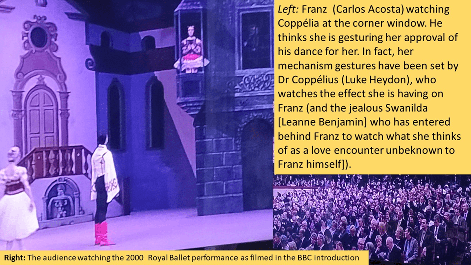 Now, although we need more than a still photograph to see it, Swanilda does some pretty impressive classic dance moves in the hope of capturing the attention of Coppélia from the book she APPEARS to be reading (for of course she can neither read nor see). Swanilda is pretty frustrated when her chosen audience ignores her, being used to being the cynosure of village eyes. And not only village eyes in the fiction of the ballet but also a real paying audience and even more the critical eyes of the rest of the company. This is a real consideration for a principal ballerina. We see this in the still I took of her (from the BBC introduction) that can be seen on the left of the above collage. We see Leanne Benjamin, whom in fact took the role of Swanilda at short notice due to illness of the intended star, engaged in preparations on stage behind the closed stage curtains as the audience assembled. She in this still invites without appearing or perhaps intending to, the eyes of the rest of the company to rest on her . This use throughout ballet stories of a kind of knowing pan-sexualised desire to have one’s body appreciated will be evident even more in Act 2. My next collage shows Franz at the same game minutes later. Franz (Carlos Acosta) is watching Coppélia at the corner window because he has boastfully told the audience (in sign language) that he has seen her watching him – and appreciatively. He thinks she is gesturing her approval of his dance for her in the still I show. In fact, her mechanism gestures have been set by Dr Coppélius (Luke Heydon), who also visibly watches the effect she is having on Franz (and the jealous Swanilda [Leanne Benjamin] who has entered behind Franz to watch what she thinks of as a love encounter with Coppélia unbeknown to Franz himself]).