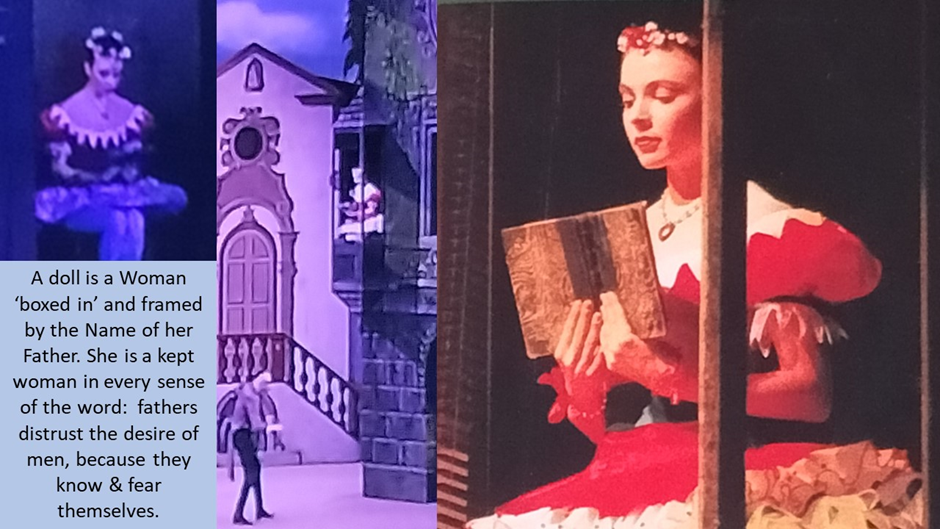 When the old man blesses the marriage of Franz and Swanilda he reverses both the deceit with which he tempted couples to suffer the temptation of another more beautiful looking woman and his own rather crabbed desire for a girl of his own making, we see him pay homage to in Act 1. As I say in the collage below there is a deep meaning here for in patriarchy, a doll is a Man-made Woman ‘boxed in’ and framed by the Name of her Father. She is a kept woman in every sense of the word: fathers distrust the desire of men, because they know & fear themselves and punish their girls for the fear they blame the girls for, which is in fact the reflex of their repressed incestuous desire.