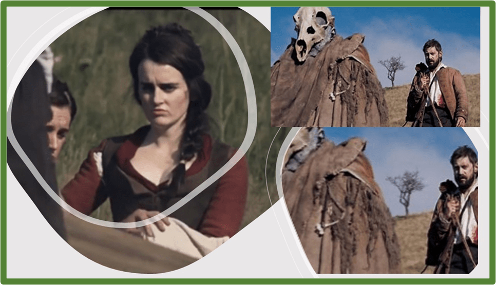 The first series of the TV version is solely based on information from David Hartley’s recreated account in Myers’ book, presumably supplemented by elements from the known history and local mythologies. It ends with a ‘Stagman’ in the bedroom of David and Grace nominating David as King, once he has proven himself to his community as a man who uses his skills and knowledge for the common good of the village and not only himself. At this point, the narrative proper of Myers novel, apart from reminiscences in it, has not even started. The first episode splits between, on the one hand, scenes that show the first interactions on misty lonely moors between David, possibly hallucinating from a deep knife wound, and the stagmen and, on the other, communal scenes in which the poverty of the village under the first tranche of the Industrial Revolution and the end of remaining feudal ownership systems are linked with their care for the possibly dying David and his resolution to pay the community back. I have to say that this threw me when I saw it for I was expecting that, as in the novel, the status of David as a ‘King’ of community would be already established as it is in the novel when the action started.