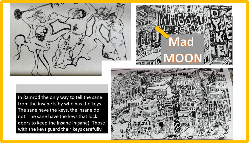 As I said in that blog, these drawings really show the moments when the faggots seize the keys to the insane asylum, and dance with them in a way that changes its meaning. In our production, the text was a little truncated and turned into verse lines with the wording changed. The audience was rehearsed through the lines and urged to shake keys (I did that – what a playful boy I felt) every time keys were mentioned. It was the only equivalent of the otherwise unused lines from the original here: