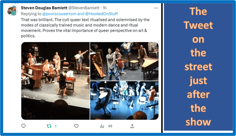 Sometimes these effects range to clothing, especially clothing visibly put on, exchanged, discarded or left in a pile as a kind of medium through which to move. My expectation of high camp was most fully destroyed. There was such variation in the self-representation by clothes. In one scene one actor moved across the stage in a voluminous mass of flexible fabric, introducing the theme of the ‘queens’. Indeed ‘stately as a galleon’ as Joyce Grenfell would have said) but with the cynical sneer removed. For there was great wit in this show but it always had aesthetic dimensions greater than that. Disco dance – was that discord though (for it represented the disco dance of faggots and their friends) or harmonious. This was about nuance and about taking further the politics I saw in my last blog on this as intersectional as modern reality itself. For as Venables says in his programme piece: