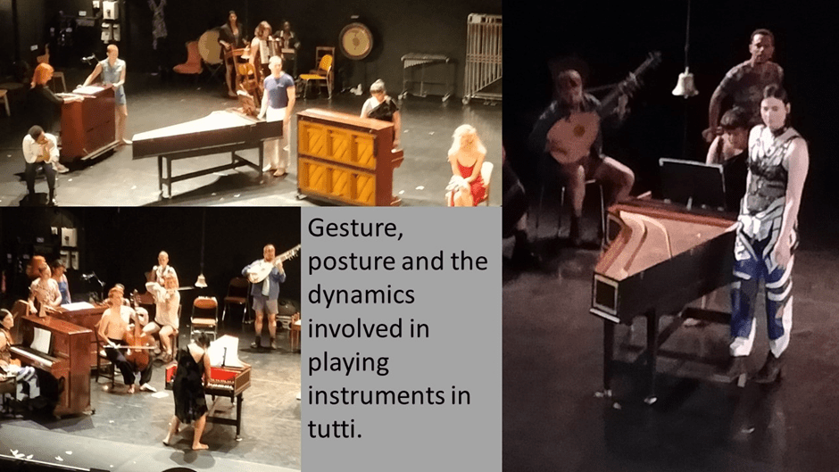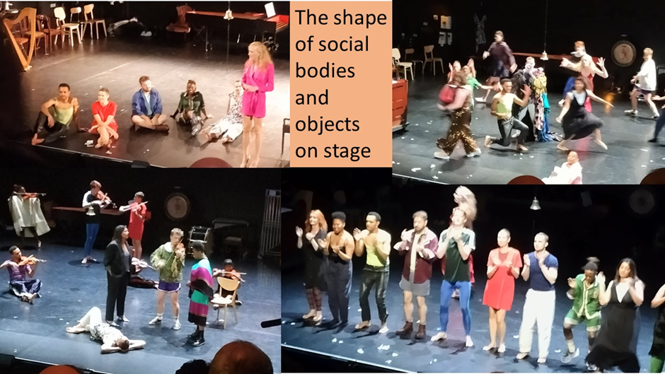 The play of shaping and reshaping of the sculpturing of space includes bodies-in-motion and instruments (often in motion too). The work is an ensemble one in the best sense, just as the instrumentation was often orchestral in feel. A major metaphor of the play’s work on us was the harmony of just and ‘sharing’ societies in comparison with the dissonances of patriarchal capitalism and its variants. These effects were created in contrastive sequence or even mixed motion, stiller sculpture of space and objects and voice (spoken or sung). Even posture mattered.