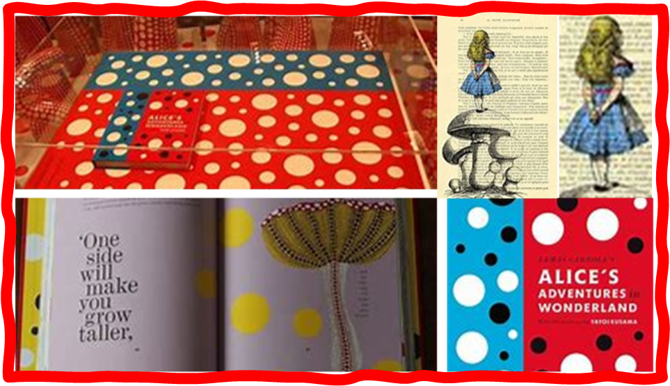 Only moments of seeing or not seeing here. But which, after all, is which. And in front of these the biomorphic and abstract three-dimensional forms (a ball for the latter, are coved with the same obliterating and blending polka dots in Kusama’s dress. By these she enacts that sense of ‘obliteration’ so associated with her – escape into a fearful infinity of repetitive simple form that is also soothes and lulls to some level of psychic unconsciousness where pain is not absent but irrelevant, coloured like the flow of flow of internal blood below a skin surface. And there is Kusama, an older lady (she makes this film again and again for different exhibitions to manifest her aging in time) dressed like Alice-in-Wonderland, She called herself ‘the modern Alice in Wonderland’ for her illustrated edition of the book and in front of her Alice sculpture in Central Park, New York: