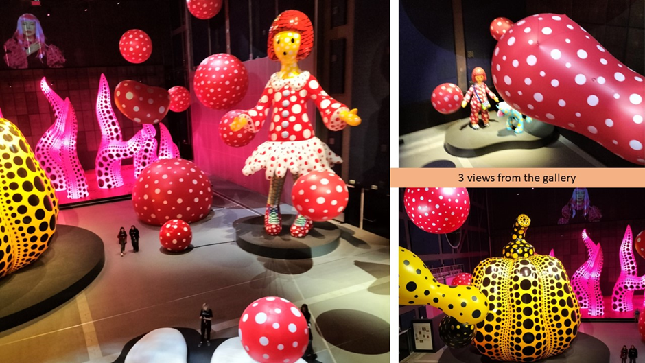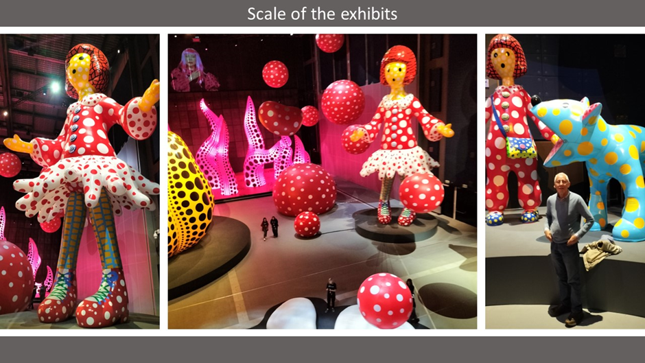 Scale matters but isolating an image, such as in a picture viewer in a mobile phone (often the majority access to sculpture these days reduces it, as I think is clear in the pictures below. The ones on left and right are from the floor of the hall. You can see the scale of the Yayoi-Chan (2.6 m.) and Toko-Ton (1.3 m.) dog and self-portrait girl statues because my husband Geoff was persuaded to stand in front of them – you have no idea of the gigantic size of the second self-portrait Yayoi-Chan (7 m.). from a camera shot, compared to the vision from above and relative to the ‘tiny’ human visitors.