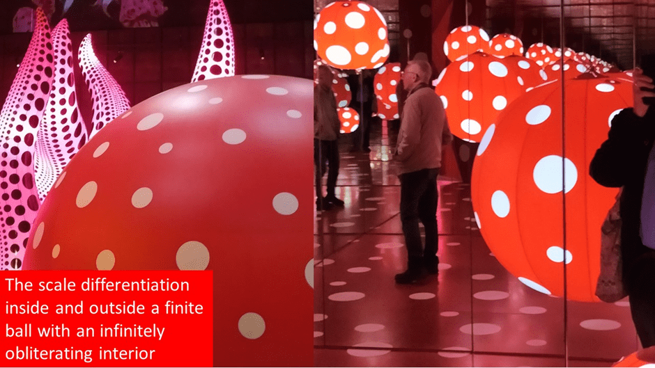 And all the sexual imagery is here. The dress is a flower-vagina made up of numerous phallic projectiles, but all this androgyny is obliterated in polka dot reversals. And in view from above or below is important, so is the difference of perspectives of outside and inside, where both yield to effects of both perspective and repetitive reflection. This idea is central to Kusama’s view of infinity as a necessary illusion of the finite. You see it in the larger fragment of Dots Obsession (2013), whereon entering the huge ball inflatable submerges you into its interior dots as a conceptual reflex from those without outside it), infinitely repeated through circumambient mirrors.
