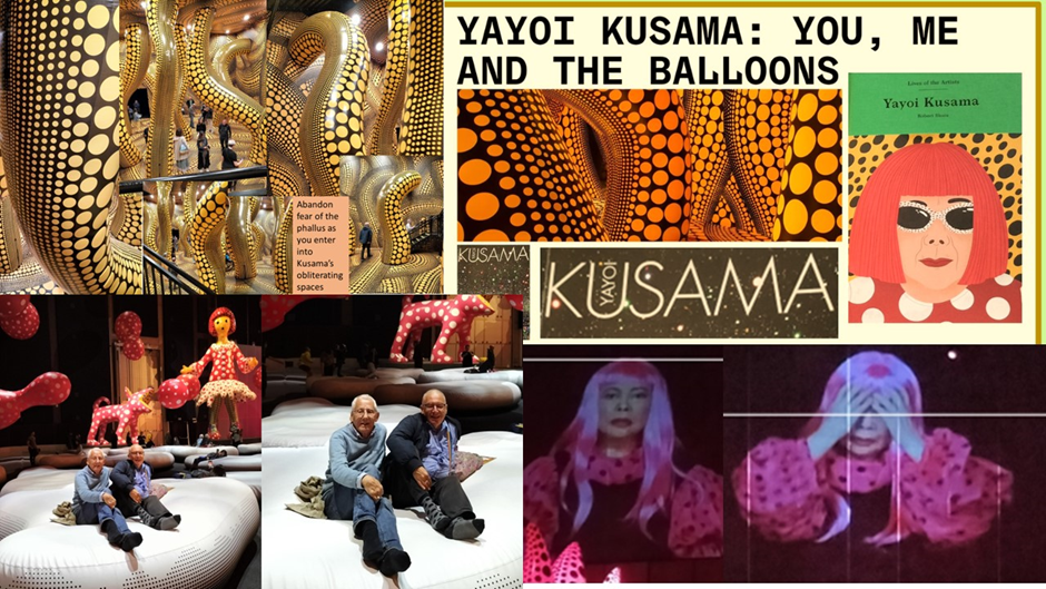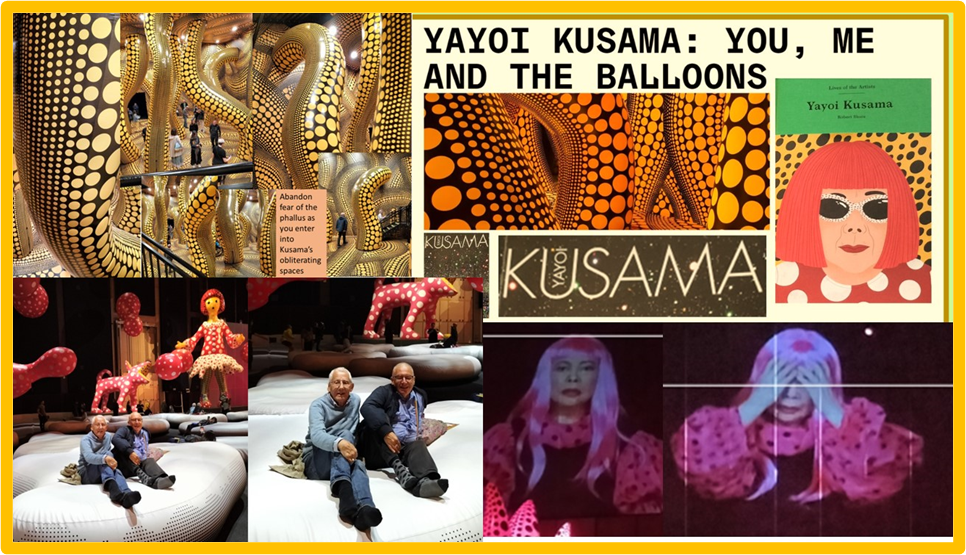 Ndevertheless, despite the fact that I am a overthinking serious boy largely, I did join in the fun when it came to the new work for this exhibition, vinyl inflatables called Clouds (2023). They lie on a mat which marks a territory one can ONLY enter unshod (someone comes to tell you so). Then ou can climd and lie and be reflected in the wall-mirror behind you and think trivial thought like: ‘I bet I look fat in this photo the kind volunteer is taking of husband and me”. And I do and I am. Dieting now. Peerhaps we all becoome CONSUMED by appearance as Kusama insists.
